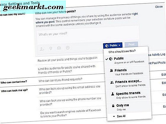 โพสต์มีการตั้งค่าความเป็นส่วนตัวที่คล้ายกันในโปรไฟล์ของคุณ คุณสามารถกำหนดให้เป็นสาธารณะเพื่อนและเพื่อนยกเว้นเฉพาะเพื่อนและเฉพาะฉัน สาธารณะเป็นจริงสำหรับธุรกิจหรือคุณเท่านั้นที่ต้องการสร้างสิ่งต่อไปนี้ ผู้ใช้โดยเฉลี่ยควรใช้เพื่อนหรือเพื่อนยกเว้นการตั้งค่าสำหรับโพสต์ หากคุณเป็นสมาชิกของกลุ่มพวกเขาก็เป็นตัวเลือกเมื่อตั้งค่าความเป็นส่วนตัว