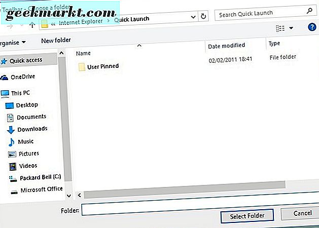 ในหน้าต่างเลือกโฟลเดอร์คุณควรใส่ % appdata% \ Microsoft \ Internet Explorer \ Quick Launch ในแถบที่อยู่และกด Enter จากนั้นคลิก เลือกโฟลเดอร์ ในหน้าต่างดังกล่าว ตอนนี้คุณจะพบเมนู Quick Launch ทางด้านขวาของแถบงานตามที่แสดงด้านล่าง