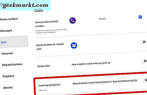 - Google Voice: ถ้าคุณเป็นผู้ใช้ Google Voice คุณจะดีใจที่ทราบว่าแอป Voice สามารถบันทึกการโทรได้ตามค่าเริ่มต้น แอ็พนี้ไม่ได้เป็นแบบอัตโนมัติและแอปจะบันทึกเฉพาะสายเรียกเข้าเท่านั้น (เพื่อที่จะพยายามหลีกเลี่ยงความกังวลโดยรอบ) แต่ก็ยังมีอยู่ ไปที่เมนูการตั้งค่าภายใน Google Voice เลือกแท็บโทรและเปิดใช้งาน "ตัวเลือกการโทรเข้า" ขณะนี้เมื่อคุณโทรเข้าใน Google Voice และแตะ "4" บนแป้นหมุนหมายเลขข้อความจาก Google จะเริ่มบันทึกเสียง คุณสามารถหยุดการบันทึกได้ตลอดเวลาด้วยการแตะ "4" อีกครั้งและข้อความอื่นจาก Google เพื่อให้ผู้โทรทราบว่าการบันทึกสิ้นสุดลง