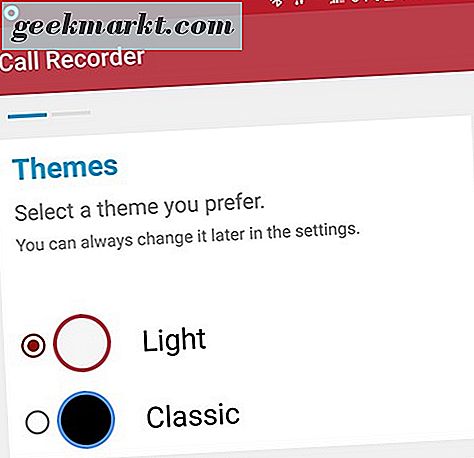 แอปพลิเคชันจะเริ่มต้นด้วยการถามว่าคุณต้องการธีมที่สว่างหรือมืด เครื่องบันทึกการโทรอัตโนมัติคือแอปที่ออกแบบมาเกือบทั้งหมดในการออกแบบวัสดุดังนั้นเราขอแนะนำให้ใช้ชุดรูปแบบแสงหากคุณสนใจเกี่ยวกับการออกแบบมาตรฐานบน Android อย่างไรก็ตามชุดรูปแบบ "คลาสสิก" ที่มืดเหมาะสำหรับโทรศัพท์ซัมซุงหรือโทรศัพท์ที่ใช้จอแสดงผล AMOLED การแสดงผลถัดไปจะขอให้คุณเปิดใช้งานการสำรองข้อมูลในระบบคลาวด์ไม่ว่าจะเป็นผ่าน Dropbox หรือ Google ไดรฟ์และจะเปิดใช้งานตามปริมาณดีขึ้นเป็นค่าเริ่มต้นเมื่อบันทึกสายเพื่อให้เสียงเรียกเข้าของโทรศัพท์ชัดขึ้นและฟังได้ง่ายขึ้น เมื่อคุณได้เลือกแล้วให้กด "เสร็จสิ้น"