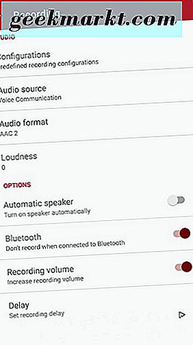 - การบันทึก: มีหลายสิ่งหลายอย่างในที่นี้และส่วนใหญ่สามารถและควรปล่อยไว้ให้เป็นค่าเริ่มต้น ที่กล่าวว่ามีตัวเลือกน้อยที่เราอาจต้องการพิจารณาการเปลี่ยนแปลง แหล่งเสียงสามารถสลับไปมาระหว่างตัวเลือกต่างๆเช่นไมโครโฟนและการโทรด้วยเสียง แต่จะดีที่สุดที่จะทิ้งข้อความนี้ไว้ใน "Voice Communication" รูปแบบเสียงสามารถสลับระหว่างไฟล์เสียงทั่วไปหลายชนิด ได้แก่ AAC, AAC2 (เปิดใช้งาน โดยค่าเริ่มต้น) และ WAV หากโทรศัพท์ของคุณประสบปัญหาในการบันทึกในรูปแบบเริ่มต้นคุณอาจต้องการเปลี่ยนการตั้งค่านี้ (ปิดการใช้งานตามค่าเริ่มต้น) ตัวเลือกที่จะไม่บันทึกเมื่อเชื่อมต่อกับบลูธูท (เปิดใช้งานตามค่าเริ่มต้น) ตัวเลือกระดับเสียงบันทึกเดียวกันที่เราเห็นในระหว่างการตั้งค่าเริ่มต้นและ ความล่าช้าในการบันทึกภาพ