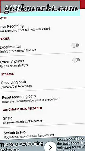 มีการตั้งค่าอื่น ๆ อีกเล็กน้อยภายใน Automatic Call Recorder ที่ไม่มีประเภทของตัวเองรวมถึงผู้เล่นจะเล่นเพลงจากภายในแอพซึ่งบันทึกจะถูกเก็บไว้ในอุปกรณ์หรือการ์ด SD และตัวเลือกในการซื้อ เวอร์ชัน Pro จาก Play สโตร์ราคา $ 6.99