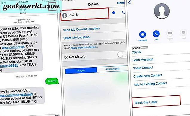หากคุณได้รับข้อความสแปมที่น่ารำคาญอย่างต่อเนื่องจากคนอื่น (หรือไม่กี่คน) จากนั้นก็ถึงเวลาแล้วที่คุณจะต้องบล็อกพวกเขา โชคดีที่เป็นเรื่องง่ายที่จะบล็อกคนในวันนี้ได้อย่างเหลือเชื่อแม้ว่าคุณจะไม่ได้ช่วยพวกเขาหรือแม้กระทั่งทราบหมายเลขของพวกเขาก็ตาม ในเธรดข้อความของคุณเพียงแค่กด "i" เล็ก ๆ ในมุมแตะที่หมายเลขของพวกเขา (ไม่ว่าจะเป็นอะไรก็ตาม) จากนั้นที่ด้านล่างคุณจะเห็นข้อความว่า Block This Caller เมื่อคุณแตะที่นี้จะทำให้มันเพื่อให้บุคคลจะไม่สามารถโทรหาคุณส่งข้อความหรือแม้กระทั่ง FaceTime คุณ