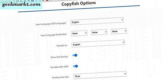 สำหรับตัวเลือกเพิ่มเติมคลิกขวาที่ไอคอน Copyfish บนแถบเครื่องมือและเลือก Options ซึ่งจะเปิดแท็บด้านล่างซึ่งคุณสามารถกำหนดค่าการแปลได้ถ้าจำเป็น ตัวอย่างเช่นหากรูปภาพมีภาษาเยอรมันคุณควรเลือกจากเมนูแบบเลื่อนลงภาษาอินพุต จากนั้นส่วนขยายสามารถแปลภาษาเยอรมันเป็นภาษาอังกฤษได้