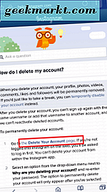 เริ่มต้นด้วยการคลิกที่แท็บโปรไฟล์ ด้านขวาสุดสุดคือแท็บการนำทางที่ด้านล่างของหน้าจอ ขออภัย Instagram ไม่มีตัวเลือกในการลบบัญชีของคุณจากภายในแอปพลิเคชันดังนั้นเราจึงจำเป็นต้องใช้เว็บเบราเซอร์ของโทรศัพท์เพื่อให้การดำเนินการนี้เกิดขึ้น เลื่อนไปที่ด้านล่างของหน้าจนกว่าคุณจะเห็นตัวเลือกสำหรับ "ศูนย์ช่วยเหลือของ Instagram" การคลิกที่นี่จะเป็นการเปิดตัวคุณในเว็บเบราว์เซอร์ที่คุณเลือกไว้ - ฉันใช้เบราว์เซอร์ของ Samsung แต่ฉันสงสัยว่าส่วนใหญ่ของคุณใช้ Chrome มีข้อมูลจำนวนมากในหน้านี้ แต่อย่าเครียดออก เลื่อนไปที่ด้านล่างของหน้าจนกว่าคุณจะพบ "Managing Your Account" ภายใต้ "Browse Topics" คุณทำไปแล้วเกือบหมดแล้วจึงไปต่อ