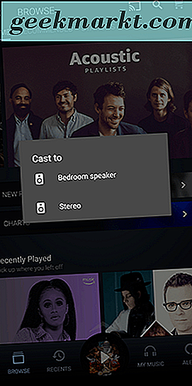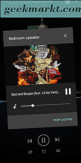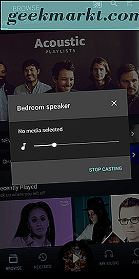 แตะที่ไอคอน "ส่ง" เพื่อดูรายการอุปกรณ์ที่สนับสนุนในเครือข่ายของคุณรวมถึงโฮมเธียเตอร์ Google โฮมมินิหรือลำโพง Home Max เลือกลำโพงที่คุณต้องการส่งไปและคุณจะได้ยินเสียงกริ๊งจากอุปกรณ์หลังจากเชื่อมต่อแล้ว เมื่อคุณเริ่มเล่นเพลงจากแอปพลิเคชัน Android แล้วแอปพลิเคชันดังกล่าวจะเริ่มเล่นลำโพงของ Google Home ในบ้านของคุณโดยอัตโนมัติ หากคุณไม่แน่ใจก่อนเริ่มเล่นไม่ว่าคุณจะเชื่อมต่อกับอุปกรณ์หรือไม่ให้ตรวจสอบไอคอน Cast ในแอปพลิเคชัน มันจะปรากฏเต็มไปด้วยสีขาวเมื่อคุณเชื่อมต่อ หากคุณยังไม่ได้เล่นเพลงสักครู่คุณอาจเห็นโทรศัพท์หรือแท็บเล็ตของคุณตัดการเชื่อมต่อจากลำโพง