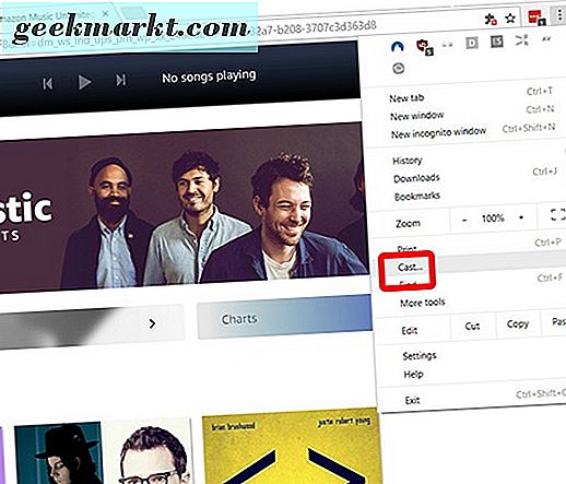 เมื่อคุณเปิดเว็บเบราเซอร์ไว้บนคอมพิวเตอร์ภายใน Chrome ให้แตะหรือคลิกที่ไอคอนเมนูแบบสามจุดที่มุมขวาบนของเบราว์เซอร์เพื่อเปิดเมนู Chrome เลื่อนเคอร์เซอร์ไปที่ด้านล่างของเมนูจนกว่าคุณจะพบตัวเลือก "ส่ง ... " และคลิก เป็นสิ่งสำคัญที่คุณยังคงอยู่บนแท็บที่มีหน้าเพลงของ Amazon เปิดมิฉะนั้นจะไม่สามารถใช้งานได้