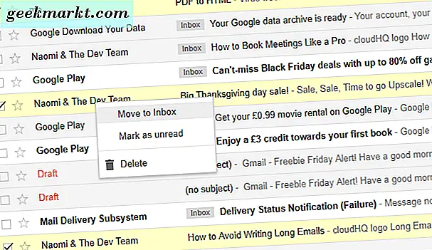 หรือคลิกขวาที่ข้อความที่เก็บถาวรและเลือก ย้ายไปที่กล่องขาเข้า เพื่อเรียกคืน หากต้องการย้ายอีเมลที่เก็บไว้จำนวนมากไปยังกล่องจดหมายของคุณคุณสามารถเลือกอีเมลหลายฉบับได้โดยคลิกที่ช่องทำเครื่องหมาย จากนั้นคุณสามารถกดปุ่ม ย้ายไปที่กล่องขาเข้า เพื่อเรียกคืนได้