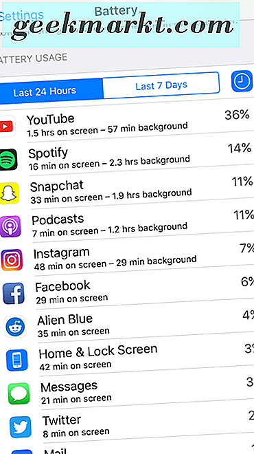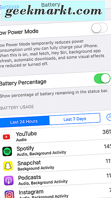นอกจากตัวบ่งชี้แล้วยังมีอีกวิธีหนึ่งที่ช่วยให้คุณสามารถใช้งานแบตเตอรี่ได้ดียิ่งขึ้นบน iPhone หากคุณมี iO 9 ขึ้นไปคุณจะมีคุณสมบัติ / การตั้งค่าที่เรียกว่า "การใช้งานแบตเตอรี่" คุณลักษณะนี้เป็นที่น่าอัศจรรย์สำหรับการติดตามการใช้งานแบตเตอรี่และสามารถแสดงให้คุณเห็นว่าแบตเตอรี่ของคุณมีการใช้งานแอพพลิเคชันต่างๆกันมากแค่ไหน คุณสามารถเปลี่ยนกรอบเวลาระหว่าง 1 วันถึง 1 สัปดาห์และตัวเลือกทั้งสองนี้จะแสดงให้คุณเห็นว่าแอปใดที่ใช้แบตเตอรี่หมดไปตลอดเวลา คุณลักษณะนี้จะช่วยให้คุณสามารถดูปริมาณแบตเตอรี่ที่แอปพลิเคชันใช้ขณะอยู่บนหน้าจอและเท่าใดที่ใช้ในแบ็กกราวด์ คนส่วนใหญ่อาจไม่ทราบว่าคุณลักษณะนี้มีอยู่ แต่อาจเป็นความช่วยเหลือหลักในการระบุว่าทำไมแบตเตอรี่โทรศัพท์ของคุณถึงตายด้วยอัตราที่น่าตกใจ