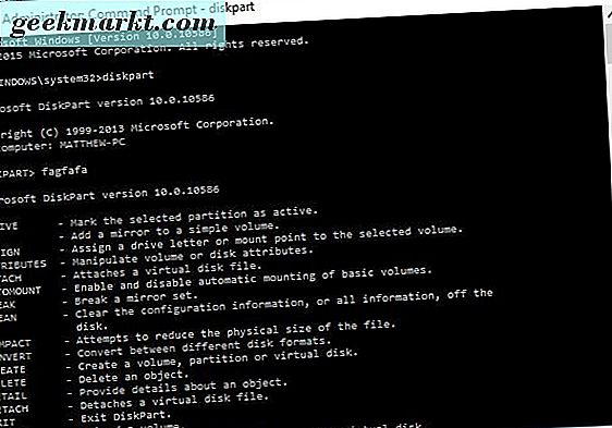 จากนั้นพิมพ์ 'diskpart' ลงใน Command Prompt แล้วกด Enter จากนั้นคุณจะเห็นบรรทัดคำสั่ง DISKPART บนหน้าต่าง พิมพ์อะไรก็ได้และกด Enter เพื่อเปิดรายการคำสั่ง DiskPart ดังที่แสดงในภาพรวมด้านล่าง